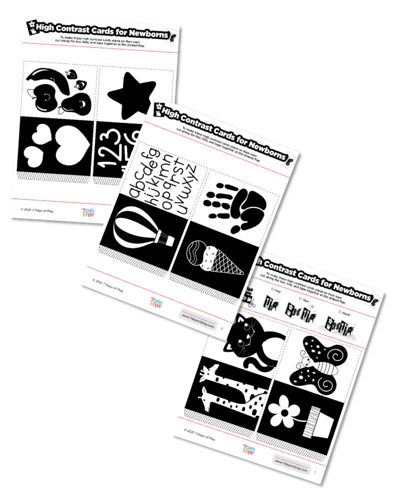 This printable set of black and white cards for babies includes 12 different high contrast images. They are great for infant stimulation! Plus, tape them together to make them stand up on their own.