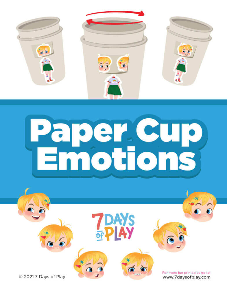 This free printable featuring the fun character, Little Ellen, is all about emotions. Follow the directions to tape or paste the images to two cups for a fun twistable game all about feelings! For a full how-to video on creating this activity visit our page all about this Emotions Activity for Preschool and Beyond.