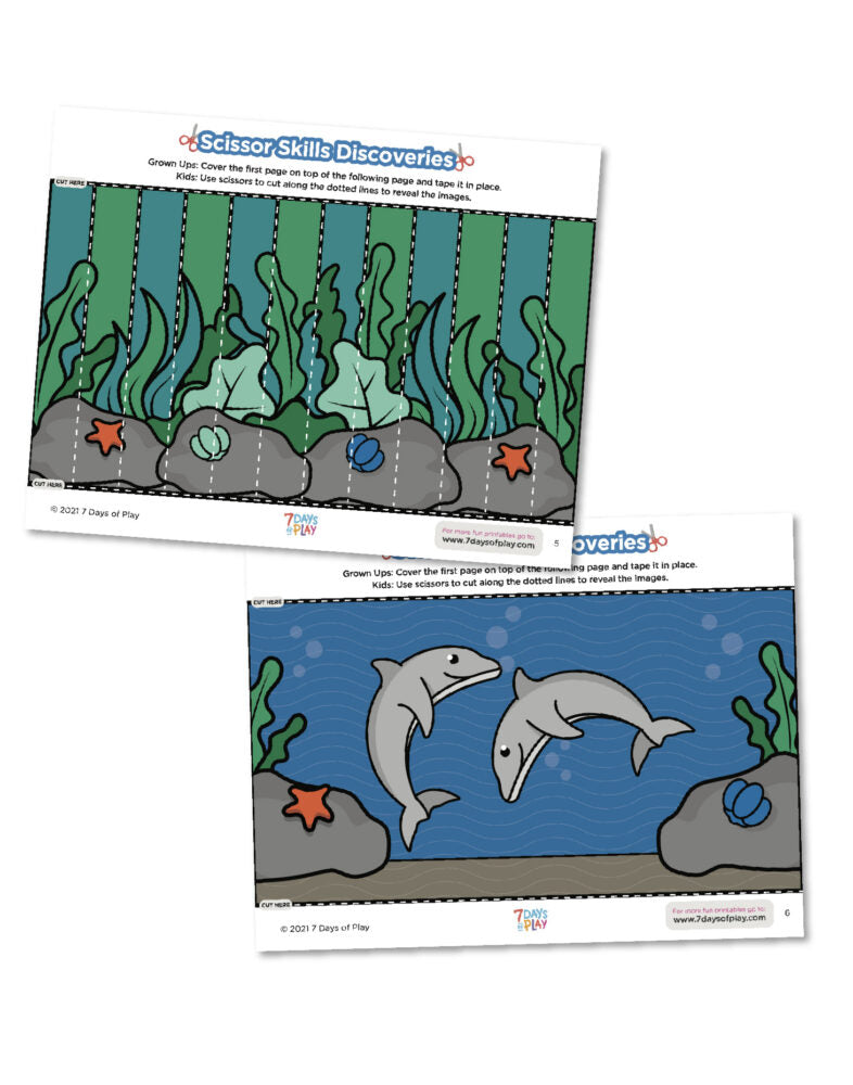 The set includes several different activities, each with its own picture hidden underneath a layer of paper. Kids will use their scissors to cut away the top layer of paper and reveal the picture underneath. For example, they can cut away the rain to uncover a rainbow, cut away the grass to find ladybugs, and cut away the seagrass to discover the dolphins. This printable was inspired by are handmade version!
