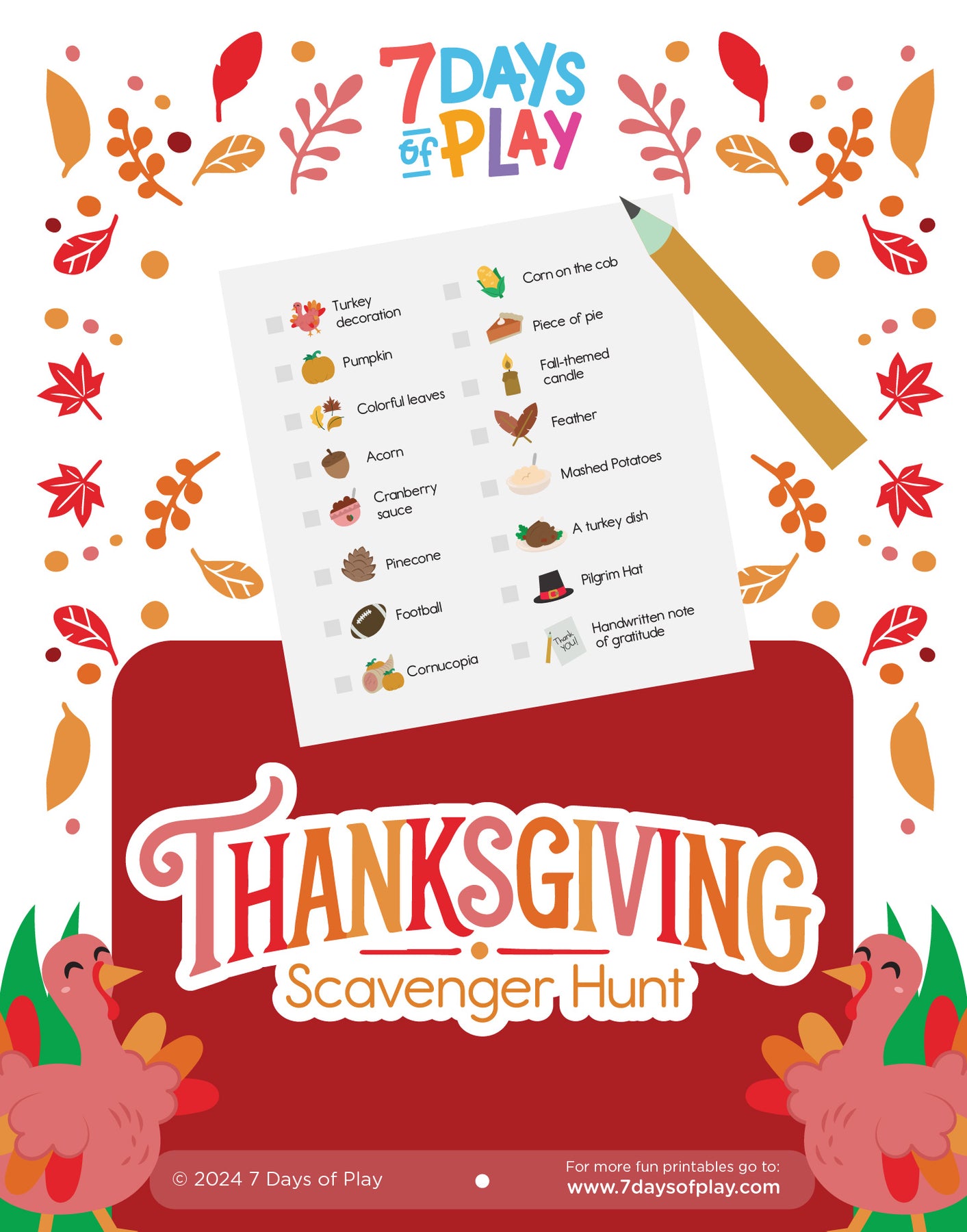 The printable scavenger hunt includes items like turkey decorations, mashed potatoes, a turkey dish, pinecones, acorns, pie slices, a cornucopia, footballs, and more! Each time a player finds one of these items, they can place a checkmark next to it on their scavenger hunt sheet. The first person to find all of the items wins!