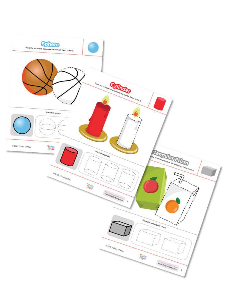 With this printable bundle, children will enhance their learning experience by engaging in various activities. They can trace and identify the shapes, connecting them to real-life objects. Additionally, they can unleash their creativity by drawing and coloring the missing halves of 3D shapes.