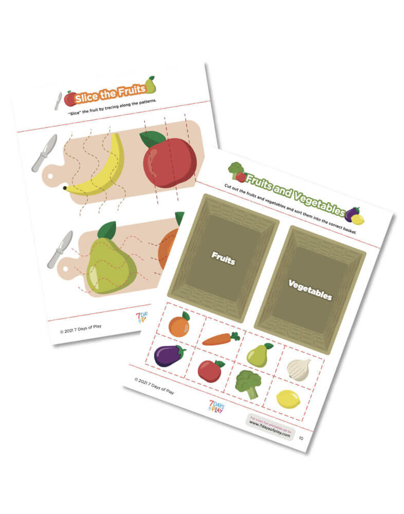 Prepare for an exciting journey as your child delves into scissor skills, color matching, tracing and writing letters, counting, phonics, patterns, and even the captivating life cycle of an apple. Each activity is thoughtfully designed to provide a multitude of opportunities for play and learning, making the exploration of fruits and vegetables an enriching experience.
