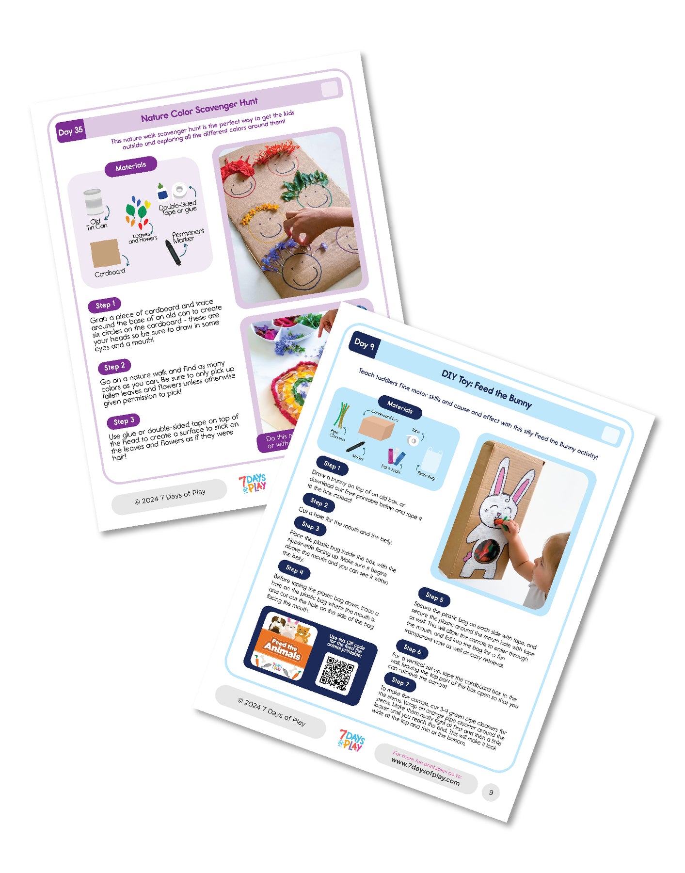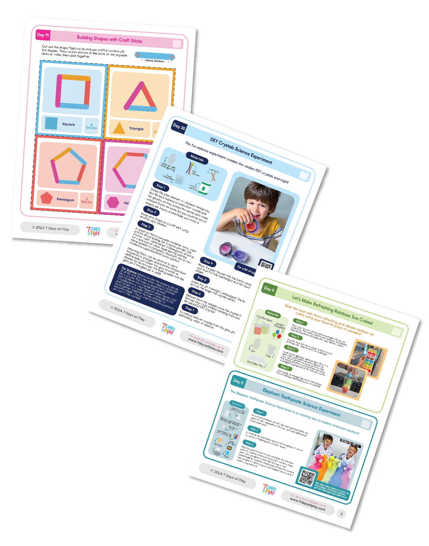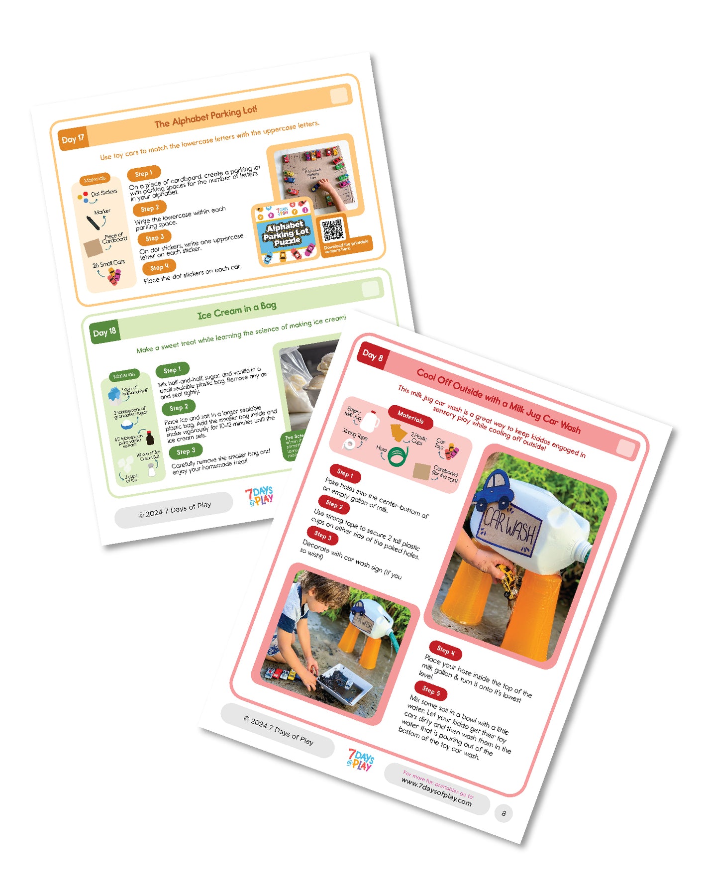 The activities include creative projects like making homemade play dough, learning the ABCs with coins, counting pizza toppings, creating refreshing rainbow ice cubes, and conducting the elephant toothpaste science experiment. Your child can also enjoy crafting a DIY turtle with a pom pom shell, playing with a DIY toy to feed the bunny, and cooling off outside with a milk jug car wash.
